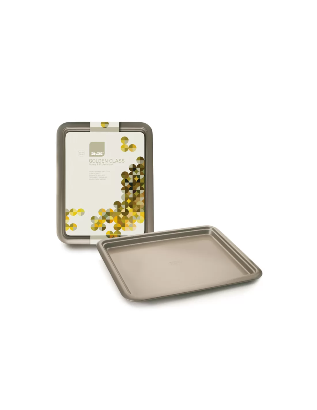 Деко для печива Ibili серії Golden Class 841041 — це високоякісний кухонний інвентар прямокутної форми, виготовлений із високоміцної сталі, що гарантує рівномірне прогрівання та стійкість до деформацій. Головною перевагою серії Golden Class є металеве двошарове антипригарне покриття Innotek, яке забезпечує ідеальний результат випікання та легке зняття виробів із поверхні. Виріб має розміри 41 x 32 см та висоту бортиків 1,6 см, що робить його ідеальним для випікання печива, пряників, рогаликів або інших кондитерських виробів. Деко вирізняється високою термостійкістю, довговічністю та придатне для миття в посудомийній машині, забезпечуючи зручність у догляді та стабільно високу якість випічки.