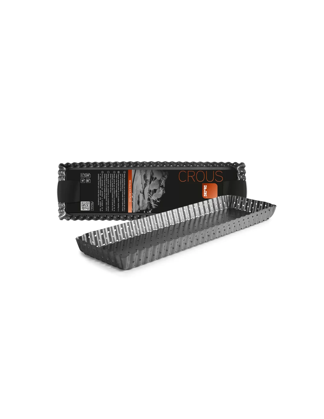 Довга прямокутна форма зі знімним дном Ibili серії Crous 835235 — це спеціалізований кондитерський інвентар подовженої форми з перфорацією, ідеальний для приготування тартів, кішів та відкритих пирогів. Основною особливістю серії Crous є наявність дрібних отворів у корпусі, що забезпечують постійну циркуляцію гарячого повітря. Це дозволяє тісту рівномірно пропікатися та гарантує хрустку скоринку без ефекту «вологого дна». Виріб виготовлений із міцної листової сталі та має високоякісне антипригарне покриття Whitford XYLAN PLUS (PFOA free). Конструкція зі знімним дном (loose bottom) дозволяє легко виймати готовий пиріг, просто піднімаючи бортик, що зберігає ідеальну форму десерту. Форма має розміри 35 x 11 см та висоту 3 см. Виріб придатний для використання в духовій шафі, морозильній камері та для миття в посудомийній машині, проте для збереження покриття рекомендується уникати металевих інструментів та абразивних засобів.