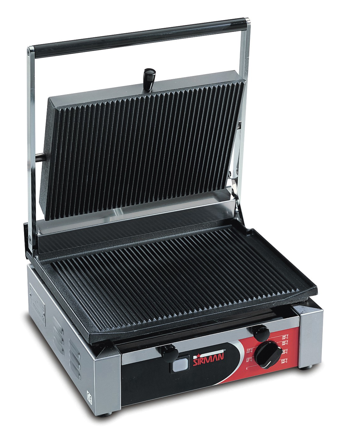 Електричний контактний гриль Sirman Cort RR від відомої італійської фабрики призначений для професійного приготування м'яса, риби, стейків та гамбургерів. Модель оснащена робочою секцією розміром 355х255 мм, де нижня та верхня плити мають рифлені поверхні, виготовлені з чавуну з антипригарним покриттям. Температурний режим гриля регулюється в межах від 0 до 300 °С за допомогою електромеханічної панелі керування зі зручним поворотним тумблером та світловим індикатором нагріву. Апарат має міцну конструкцію вагою 22 кг, потужність 2,1 кВт та встановлюється на чотири гумові ніжки, які регулюються по висоті для стабільного розміщення на робочій поверхні.