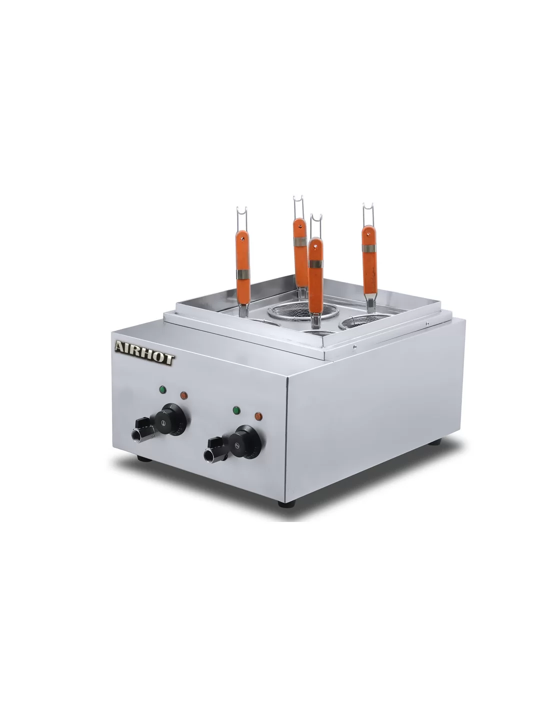 Макароноварка Airhot PC-4 розроблена для швидкого та якісного приготування різноманітних видів макаронних виробів у закладах громадського харчування. Пристрій оснащений двома автономними ваннами об’ємом по 8 літрів кожна, що дозволяє готувати різні типи продуктів одночасно, не змішуючи їх. У комплекті постачаються чотири сітчасті кошики, які зручно розміщуються в резервуарах. Корпус та робочі ємності виготовлені з високоякісної нержавіючої сталі, що гарантує надійність та легкість у гігієнічному догляді. Для безпеки та точності роботи кожна зона нагріву обладнана двома термостатами — робочим та аварійним. Особливістю моделі є наявність кранів для зливу води, що значно спрощує обслуговування апарата. При потужності 4 кВт макароноварка забезпечує високу швидкість закипання води та стабільність процесу варіння.