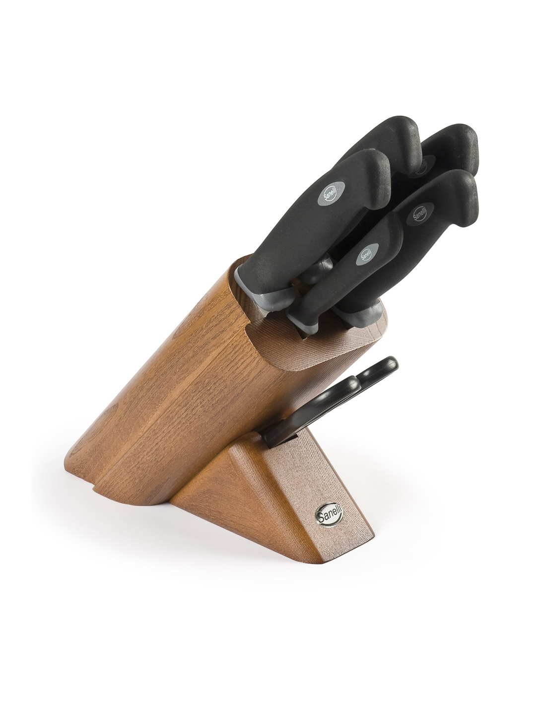 Професійний набір ножів Sanelli Gourmet у дерев’яній підставці вирізняється своєю винятковою практичністю та високою функціональністю. Комплект включає шість спеціалізованих інструментів (ніж для печені 24 см, кухарський ніж 18 см, ніж для обвалки 16 см, ніж для хліба 24 см, овочевий ніж 10 см та кухонні ножиці з нейлоновими ручками) та елегантну підставку з деревини кольору вишні. Виготовлені з високоякісної нержавіючої сталі з додаванням молібдену та вуглецю, ці інструменти є ідеальним рішенням для професійної кухні: вони оснащені запатентованими ергономічними руків’ями з подвійним формуванням, що забезпечують надійне антиковзне захоплення та комфорт навіть при тривалій роботі. Традиційне ручне заточування з опуклим профілем гарантує тривалу гостроту та стійкість до корозії. Надійна італійська конструкція забезпечує довговічність та гігієнічність, що робить цей набір незамінним помічником як для шеф-кухарів, так і для досвідчених аматорів, які цінують порядок та професійну якість на кухні.