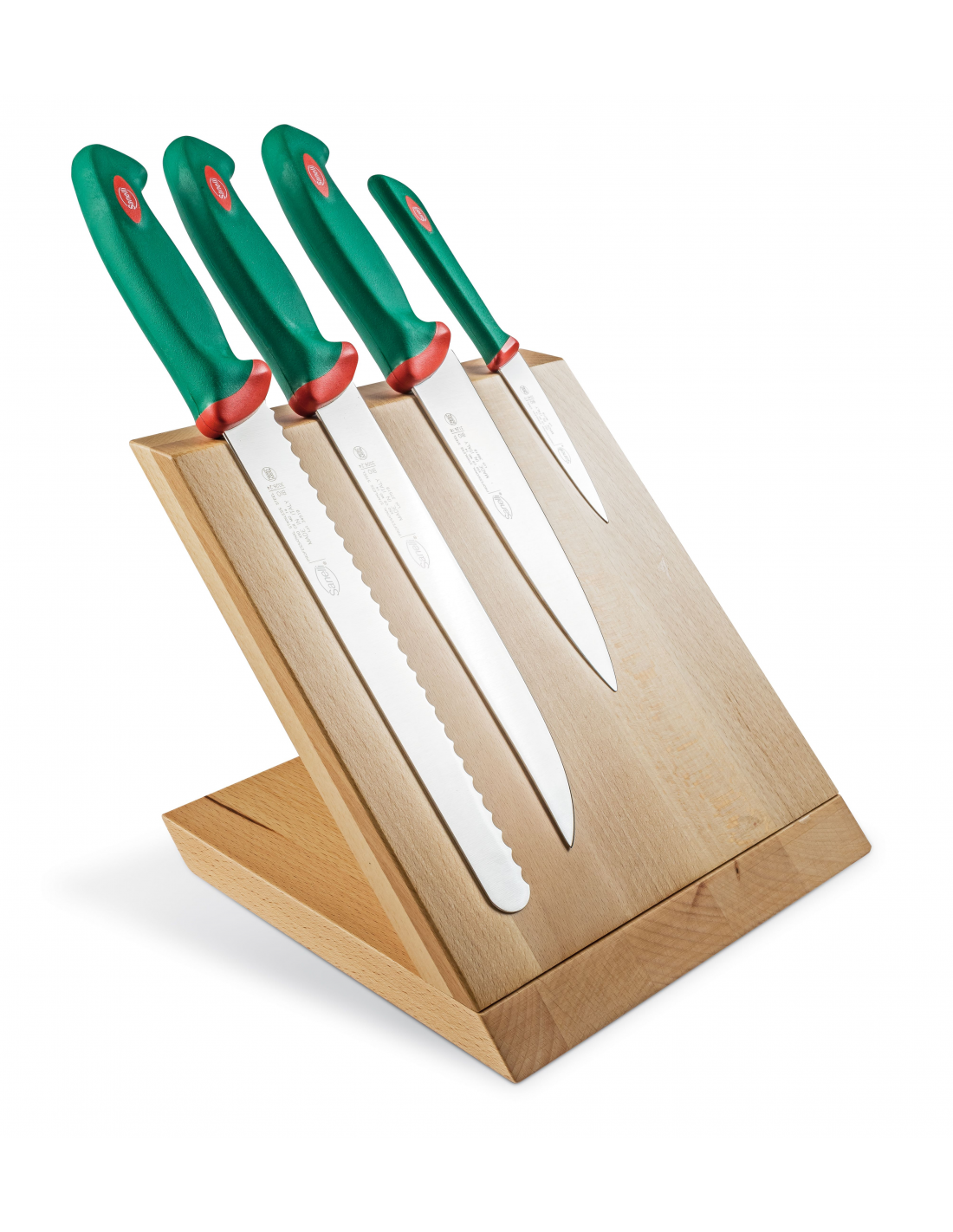 Магнітна похила підставка з набором ножів Sanelli 926604 серії Premana Professional — це стильне та функціональне рішення для організованого зберігання професійних інструментів на кухні. У комплект входять чотири базові ножі: ніж для печені довжиною 24 см, ніж для хліба довжиною 24 см із зубчастою кромкою, універсальний кухонний ніж довжиною 18 см та ніж для чищення овочів довжиною 10 см. Магнітна система забезпечує надійну фіксацію лез на відкритій поверхні, що дозволяє миттєво вибрати потрібний інструмент, а похила форма підставки гарантує максимальну зручність і безпеку під час експлуатації. Леза ножів виготовлені з високоякісної нержавіючої сталі з твердістю 54–56 HRC, що забезпечує ідеальний баланс між гнучкістю та тривалим збереженням гостроти. Запатентована ергономічна рукоятка зеленого кольору з нековзного матеріалу оснащена антибактеріальною добавкою Biomaster на основі іонів срібла для безперервного гігієнічного захисту. Набір повністю відповідає строгим нормам харчової безпеки, витримує професійну стерилізацію та придатний для миття в посудомийній машині.