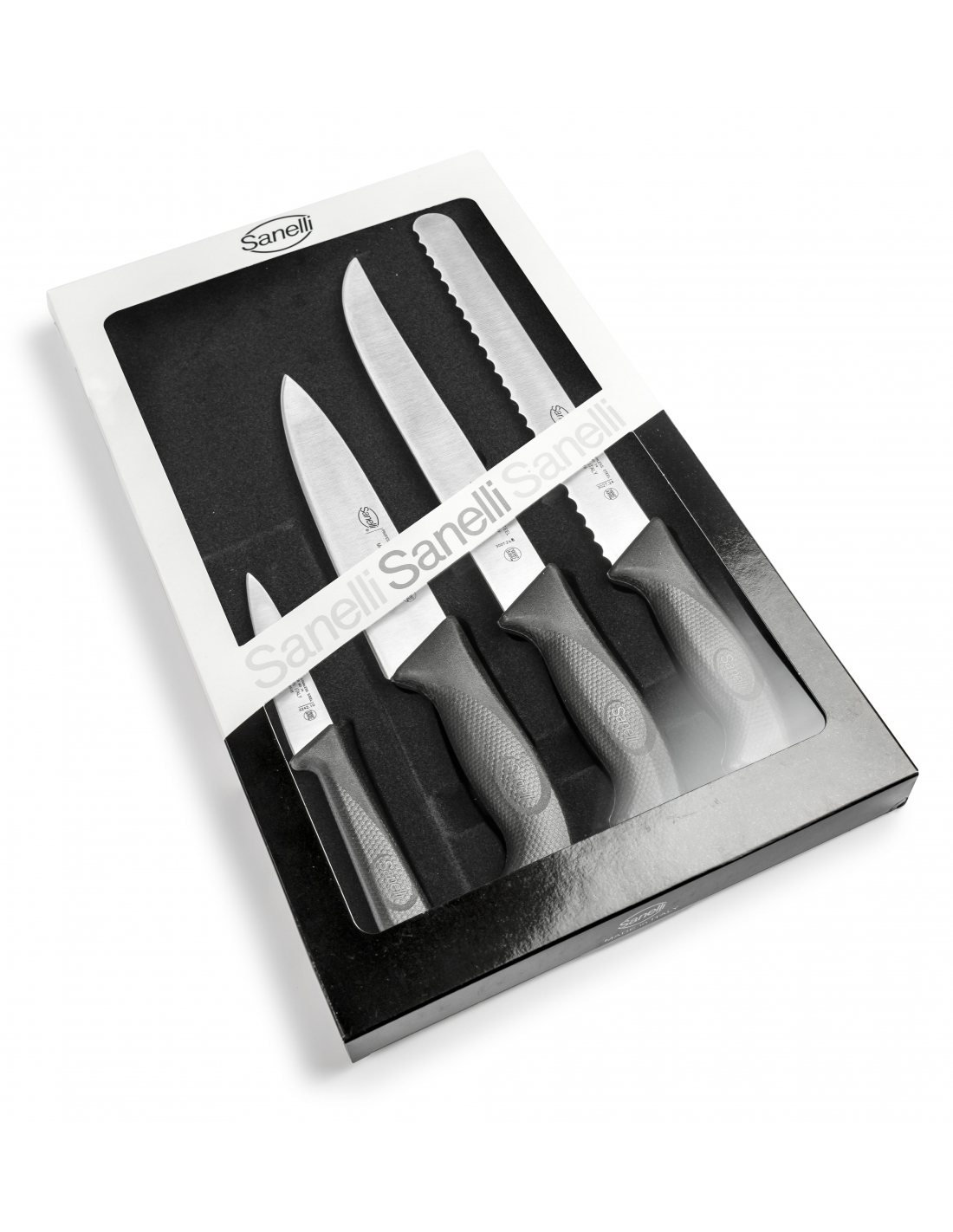 Професійний набір ножів Sanelli 909204 із серії Skin складається з чотирьох незамінних інструментів, що забезпечують повний цикл підготовчих робіт на професійній або домашній кухні: ножа для печені (24 см) для ідеальної нарізки приготованого м’яса, зубчастого ножа для хліба (24 см), універсального кухонного ножа (18 см) для овочів та фруктів, а також зручного ножа для чищення (10 см). Кожен виріб оснащений лезом із високоякісної нержавіючої сталі Bonpertuis із твердістю 54–56 HRC, що гарантує виняткову ріжучу здатність та тривале збереження гостроти. Головною перевагою серії Skin є інноваційне ергономічне руків’я з унікальною текстурованою поверхнею, яка забезпечує максимально надійне захоплення та повний контроль, запобігаючи ковзанню руки навіть за інтенсивного використання. Конструкція ножів повністю відповідає суворим гігієнічним нормам HACCP, що виключає накопичення бактерій у місцях з’єднання металу та пластику. Набір поставляється у фірмовому пакуванні, вирізняється високою зносостійкістю, стійкий до професійної стерилізації та придатний для регулярного миття в посудомийній машині.