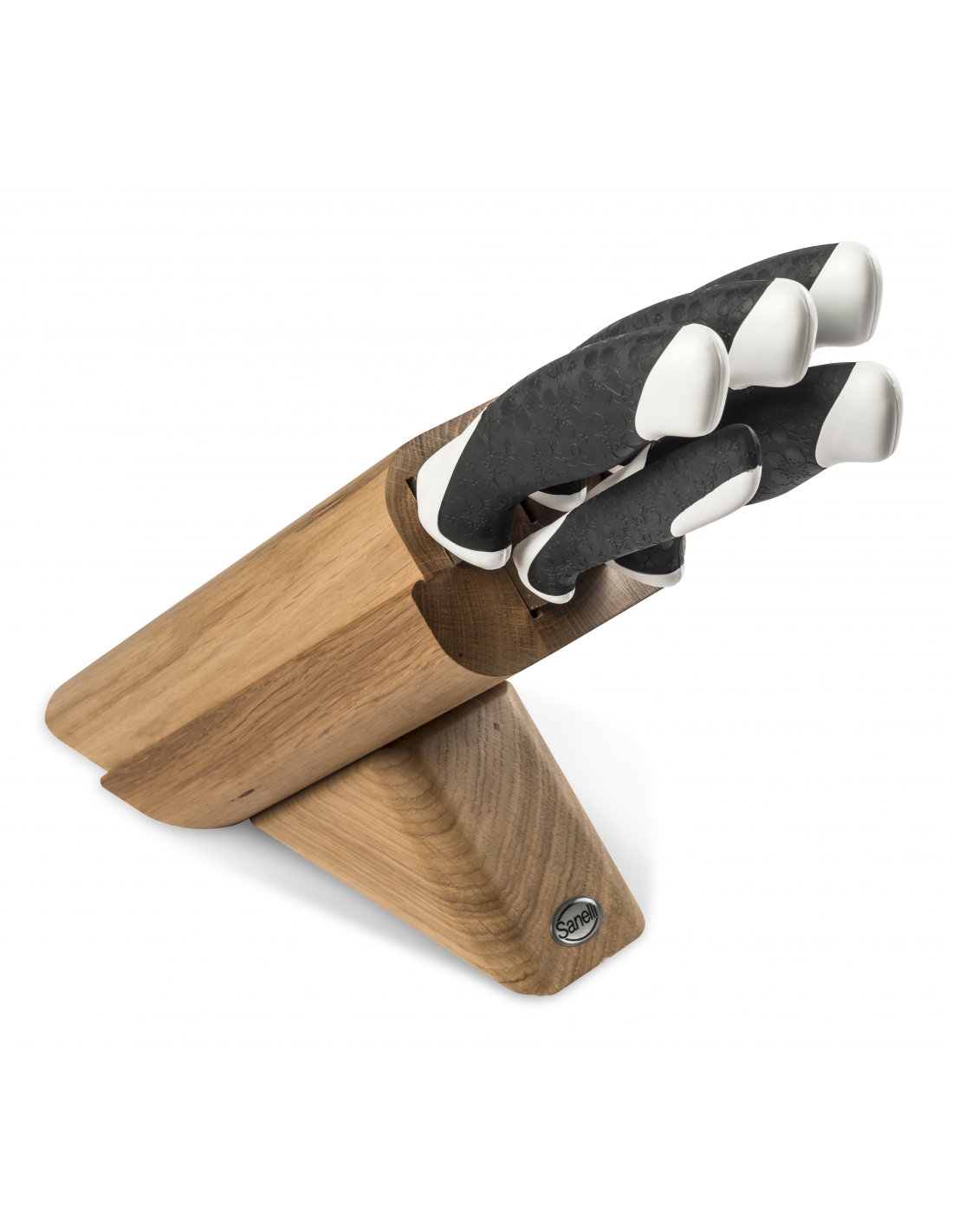 Професійний набір кухонних ножів Sanelli 931505 серії Sakura поставляється в класичній підставці з масиву дуба Leck, що відрізняється довговічністю та елегантним дизайном. Леза ножів виготовлені з високоякісної нержавіючої сталі марки AISI 420 C, яка забезпечує чудову стійкість до корозії та тривале збереження гостроти. Характерною особливістю серії є ергономічне двокомпонентне руків’я з унікальною антиковзною текстурою, що нагадує цвітіння сакури, що гарантує надійне захоплення та комфорт навіть при тривалій роботі. Комплект включає ніж для печені довжиною 23 см із напівжорстким лезом для акуратного нарізання готового м'яса, ніж для хліба довжиною 23 см із зубчастим лезом для випічки та піци, а також універсальний кухоний ніж довжиною 18 см для овочів та фруктів. Крім того, набір містить гнучкий ніж для філетування риби довжиною 20 см, що дозволяє виконувати надточні розрізи, та овочевий ніж довжиною 10 см для чищення та підготовки продуктів. Весь набір відповідає суворим гігієнічним стандартам і придатний для регулярного миття в посудомийній машині.