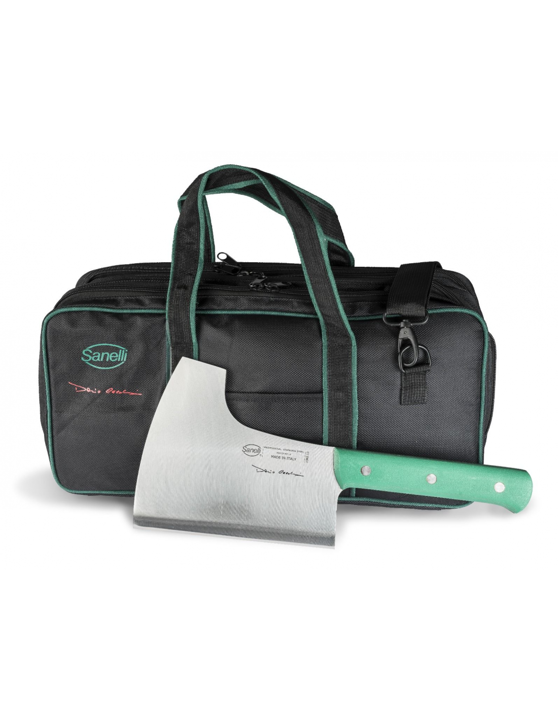 Революційна сумка «Майстер М’ясник» Sanelli 980612 містить набір професійних інструментів, відібраних найвідомішим м’ясником Італії Даріо Чеккіні, та ідеально підходить для легкого, безпечного і зручного перенесення аксесуарів, надійно захищаючи їхню кромку при транспортуванні. Усі ножі в комплекті виготовлені на замовлення з ексклюзивним лазерним підписом Даріо Чеккіні на лезі та оснащені ергономічними руків’ями подвійного лиття з нековзкого матеріалу з антибактеріальною добавокою Biomaster. Набір включає три французькі ножі з жорстким лезом довжиною 22 см, 27 см та 33 см для обвалювання, чищення та нарізання сирого м’яса, а також ніж для оброблення довжиною 18 см. Для точного зняття шкіри, видалення сухожиль і роботи близько до кістки передбачено обвалювальний ніж довжиною 16 см та спеціальний ніж для відділення від кісток довжиною 13 см із загостреними лезами. Також до комплекту входять ніж для фруктів та овочів довжиною 10 см із напівжорстким лезом, мусат довжиною 30 см для заточування середніх і довгих лез та професійна пила з нержавіючої сталі довжиною 30 см разом із трьома змінними полотнами. Комплект доповнюють жорсткий ніж вагою 1,3 кг із лезом 22 см, конструкція якого дозволяє розбивати кістки за допомогою спеціального заднього зрізу, та сертифіковані CE рукавички зі сталевої сітки з ергономічним дизайном для максимального захисту та прилягання під час роботи м’ясника.