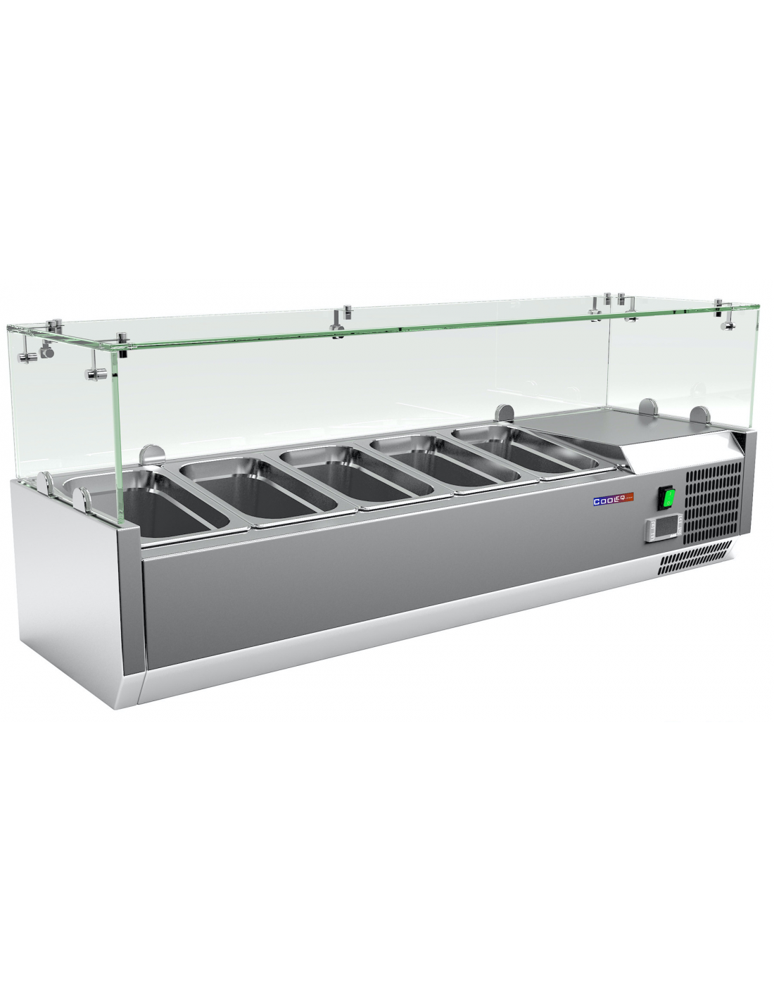 COOLEQНастільна холодильна вітрина Cooleq VRX 1200/330 є професійним обладнанням, спеціально розробленим для ефективної демонстрації, охолодження та короткочасного зберігання різноманітних салатів та закусок на підприємствах громадського харчування та торгівлі. Корпус пристрою повністю виготовлений з високоякісної нержавіючої сталі, що гарантує довговічність та відповідність гігієнічним нормам. Модель розрахована на встановлення п’яти гастроємностей формату GN1/4 з максимальною глибиною до 15 сантиметрів, при цьому важливо враховувати, що самі ємності не входять у комплект постачання. Загальний об'єм вітрини становить 32,6 літра, а стабільний температурний режим у діапазоні від +2 до +8 градусів Цельсія забезпечується за рахунок статичної системи охолодження та використання безпечного фреону R600a. Обладнання працює від стандартної мережі з напругою 220 В та має потужність 125 Вт. Конструкція вітрини є досить компактною: габаритні розміри без скла складають 1200х330х240 мм, тоді як повні нетто-розміри становлять 1200x335x440 мм при вазі 39 кг.