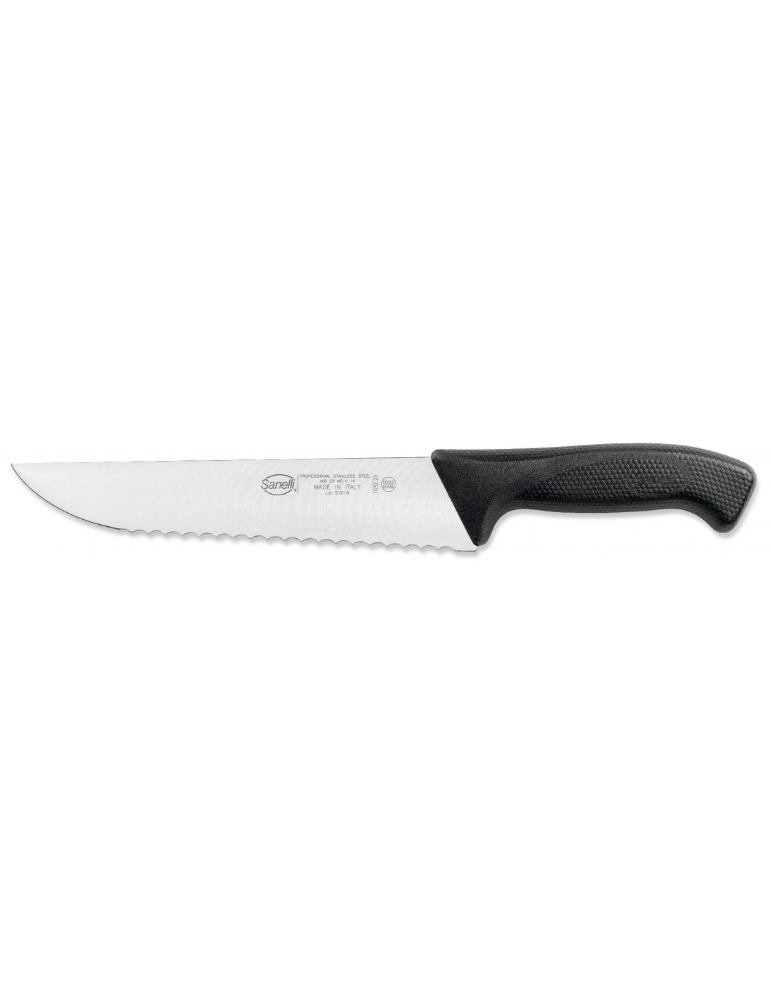 Французький зубчастий ніж Sanelli 103222 із серії Skin оснащений жорстким лезом довжиною 22 см і призначений для професійної підготовки м'яса та риби. Завдяки серрейторній заточці цей інструмент ідеально підходить для перерізання сухожиль і нервів, а також для обробки дрібної та середньої риби. Лезо виготовлене зі спеціальної нержавіючої сталі Bonpertuis із твердістю 54–56 HRC, що забезпечує високу ріжучу здатність і тривалу стійкість кромки. Характерною особливістю серії Skin є інноваційне руків'я з особливою текстурованою поверхнею, яка гарантує максимально надійне та комфортне захоплення, запобігаючи ковзанню руки навіть за інтенсивного використання. Матеріал руків'я повністю відповідає гігієнічним вимогам щодо контакту з харчовими продуктами. Ергономічний дизайн і збалансована конструкція роблять цей ніж надійним помічником на професійній кухні. Виріб стійкий до стерилізації та придатний для миття в посудомийній машині.