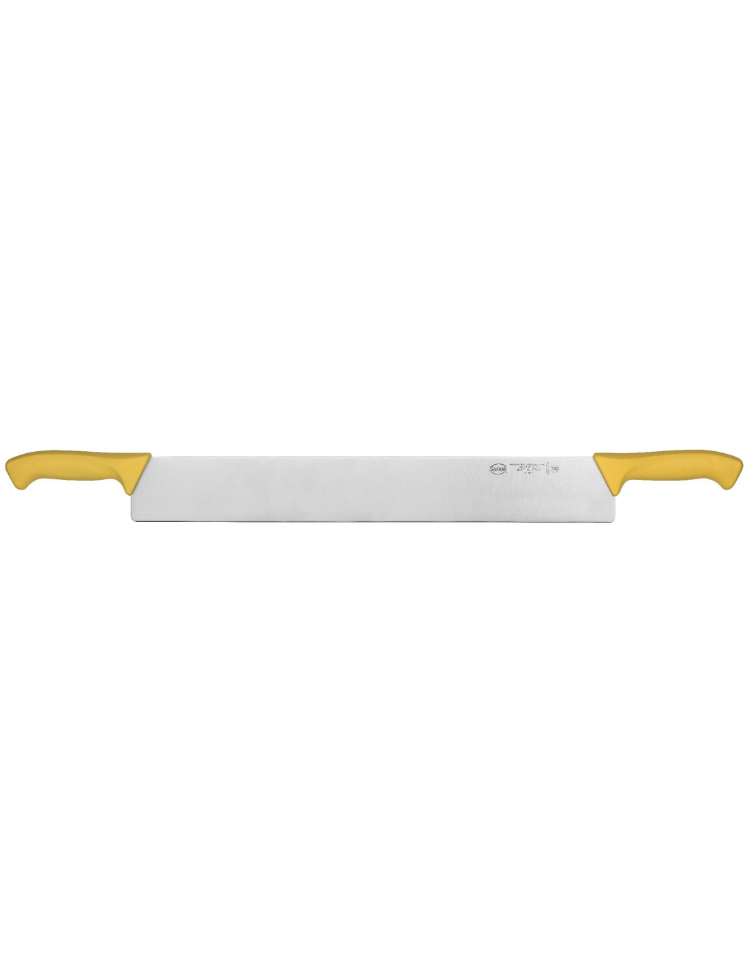 Професійний ніж для сиру з двома руків’ями Sanelli 309250.G із серії Skin оснащений лезом довжиною 50 см. Цей спеціалізований інструмент розроблений для розрізання цілих сирних голів. Конструкція з двома руків’ями дозволяє створювати рівномірний тиск по всій довжині леза, що забезпечує точний та легкий поділ великих об’ємів продукту. Жовтий колір руків’я відповідає нормам системи HACCP на професійній кухні. Робоча частина виготовлена з високоякісної нержавіючої сталі Bonpertuis із твердістю 54–56 HRC, яка вирізняється високою ріжучою здатністю та міцністю. Головною особливістю серії Skin є інноваційні ергономічні руків’я з унікальною текстурованою поверхнею, яка гарантує надійне захоплення та комфорт, запобігаючи ковзанню рук під час роботи. Матеріал руків’я повністю відповідає суворим гігієнічним нормам щодо контакту з харчовими продуктами. Виріб стійкий до професійної стерилізації та придатний для регулярного миття в посудомийній машині.