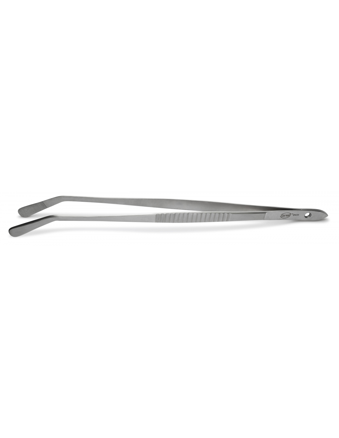 Професійний кулінарний пінцет Sanelli довжиною 30 см із вигнутими кінчиками виготовлений із високоякісної нержавіючої сталі та є спеціалізованим інструментом для шеф-кухарів, яким необхідна особлива точність та зручний кут огляду під час маніпуляцій з інгредієнтами. Вигнута форма робочої частини дозволяє делікатно викладати дрібні елементи страв, працюючи під кутом, що забезпечує кращу видимість робочої поверхні та тарілки під час сервірування. Завдяки значній довжині інструмент ідеально підходить для безпечного перевертання продуктів на розпеченому грилі, сковороді або у фритюрі, дозволяючи кухарю працювати на безпечній відстані від джерела тепла. Суцільнометалева конструкція з дзеркальним поліруванням гарантує виняткову довговічність, повну корозійну стійкість та абсолютну відповідність нормам HACCP, оскільки пінцет не має прихованих порожнин, легко миється в професійних машинах та піддається регулярній термічній дезінфекції.