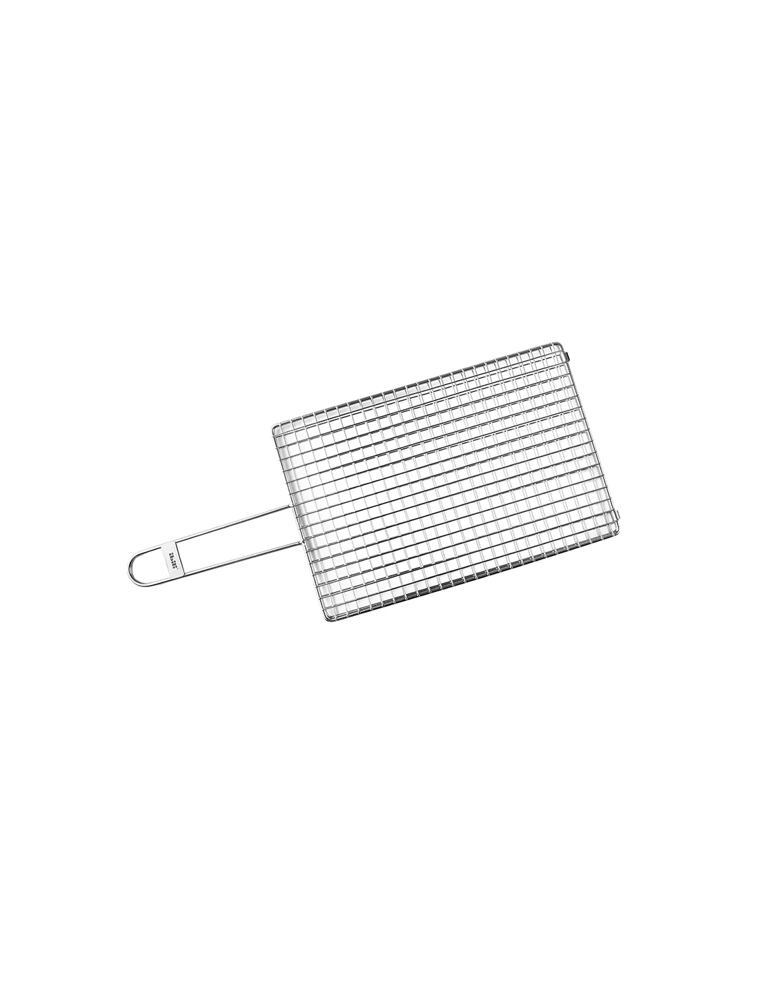 Подвійна решітка для гриля Ibili 770400 — це спеціалізований кухонний аксесуар професійної якості, розроблений для делікатного приготування дрібних та подовжених продуктів на відкритому вогні або в духовці. Виріб повністю виготовлений із високоякісної нержавіючої сталі 18%, що гарантує його виняткову термостійкість, міцність та стійкість до корозії під час інтенсивного використання. Решітка має робочу поверхню розміром 30x20 см із дрібним кроком плетіння 1x1 см, що робить її ідеальною для одночасного приготування до 12 порцій рибних щічок (кокочас), пагонів дикої спаржі, скибочок бекону, овочів або невеликих шматочків м'яса. Завдяки надійній подвійній конструкції продукти міцно фіксуються всередині, дозволяючи легко перевертати їх одним рухом для рівномірного просмажування без ризику випадіння чи пошкодження структури. Цей девайс від бренду Ibili відрізняється високою гігієнічністю, не впливає на смак страв і підходить для миття в посудомийній машині, стаючи незамінним інструментом для шанувальників вишуканого грилінгу.