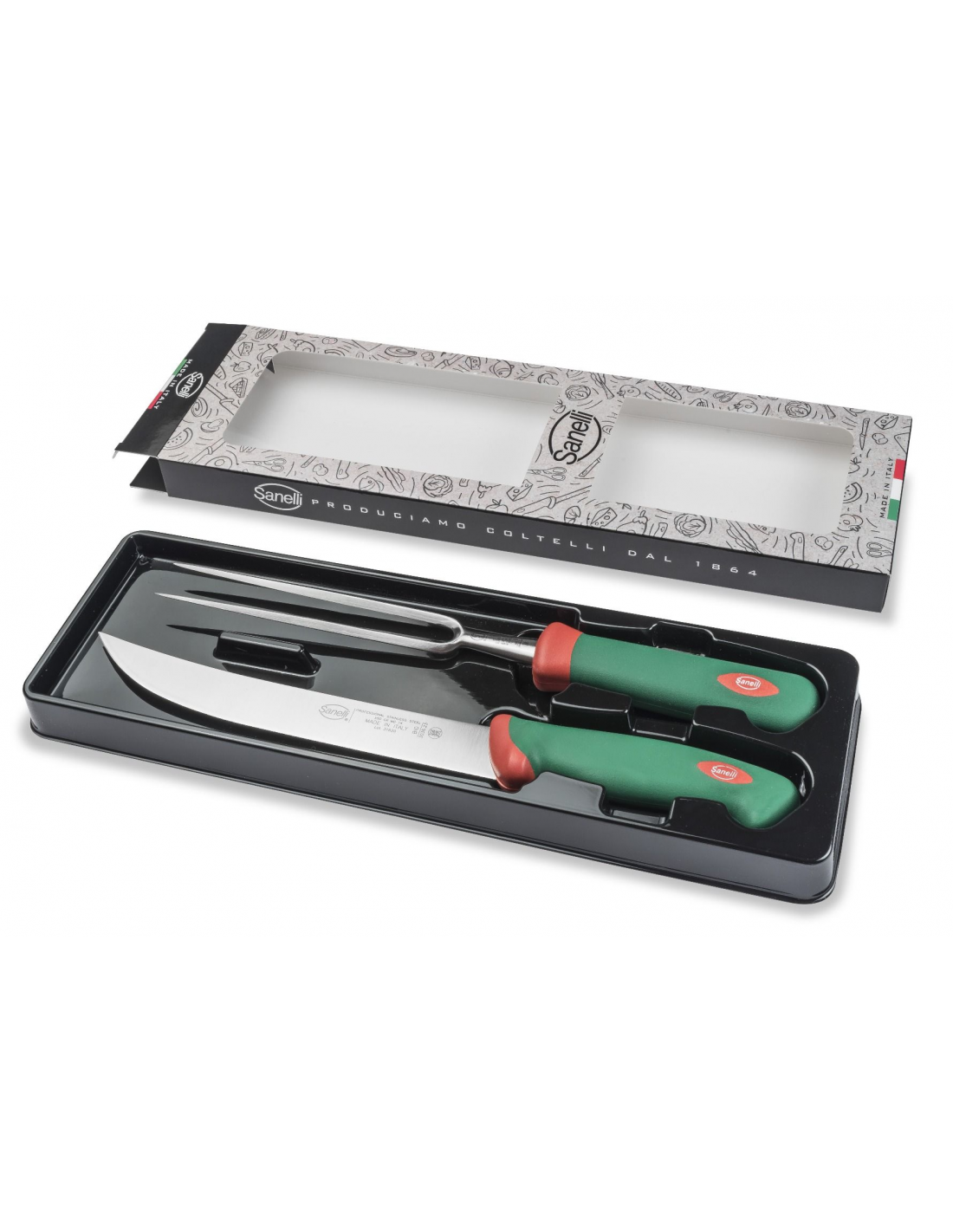Профессиональный набор для BBQ Sanelli 918602 серии Premana Professional включает два незаменимых инструмента для любителей приготовления мяса на огне: нож типа «ятаган» с лезвием длиной 23 см и кованую вилку длиной 33 см (длина лезвия 20 см). Нож с полужестким изогнутым лезвием идеально подходит для нарезки крупных кусков сырого или готового мяса, в то время как массивная кованая вилка обеспечивает надежную фиксацию продукта во время нарезки и сервировки. Лезвия изготовлены из высококачественной нержавеющей стали с твердостью 54–56 HRC, что гарантирует отличную режущую способность и длительную эксплуатацию в сложных условиях. Запатентованная эргономичная рукоятка зеленого цвета выполнена из нескользящего материала и оснащена антибактериальной технологией Biomaster с ионами серебра для постоянной гигиены. Изделия полностью соответствуют нормам пищевой безопасности, выдерживают профессиональную стерилизацию и подходят для мытья в посудомоечной машине.