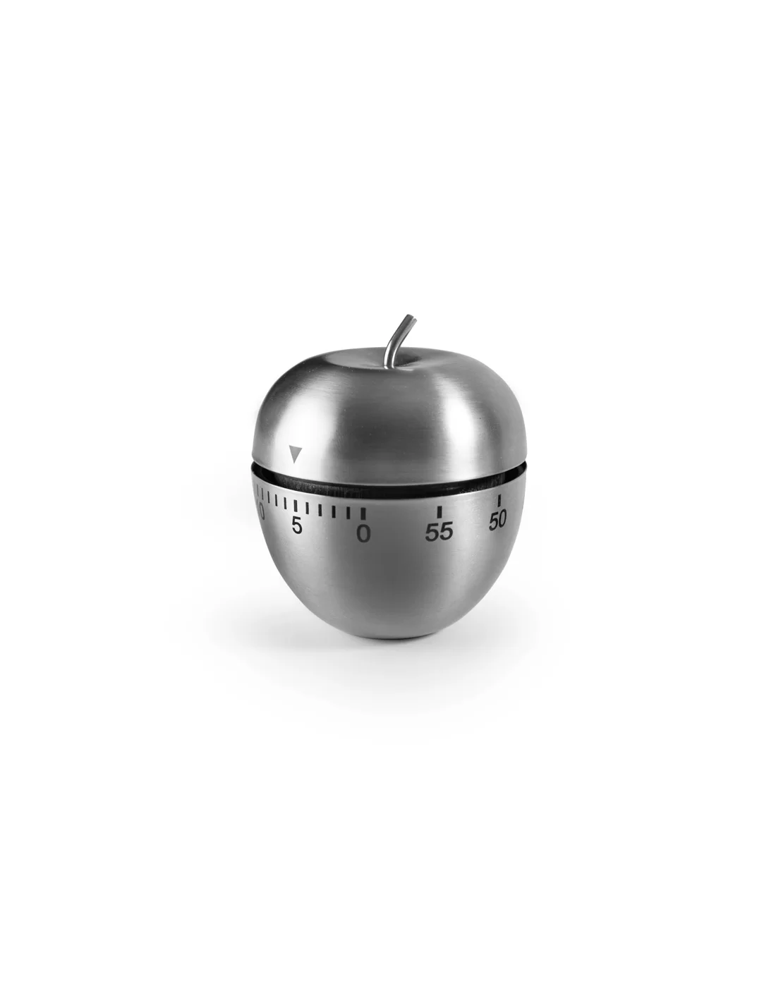 Механический кухонный таймер Ibili 743408 — это надежный и стильный инструмент, выполненный в оригинальной форме яблока, что позволяет точно контролировать время приготовления блюд. Корпус изделия изготовлен из высококачественной нержавеющей стали с матовым покрытием, что обеспечивает прочность, устойчивость к коррозии и долговечность. Сферическая конструкция «яблока» диаметром 6 см увенчана изящным металлическим хвостиком и разделена на две части: подвижную верхнюю половину для настройки времени и нижнее основание с четкой шкалой от 0 до 55 минут. Благодаря компактным размерам (6x6 см) и эстетичному дизайну от испанского бренда Ibili, этот таймер служит не только функциональным помощником, но и эффектным декоративным элементом на современной кухне.