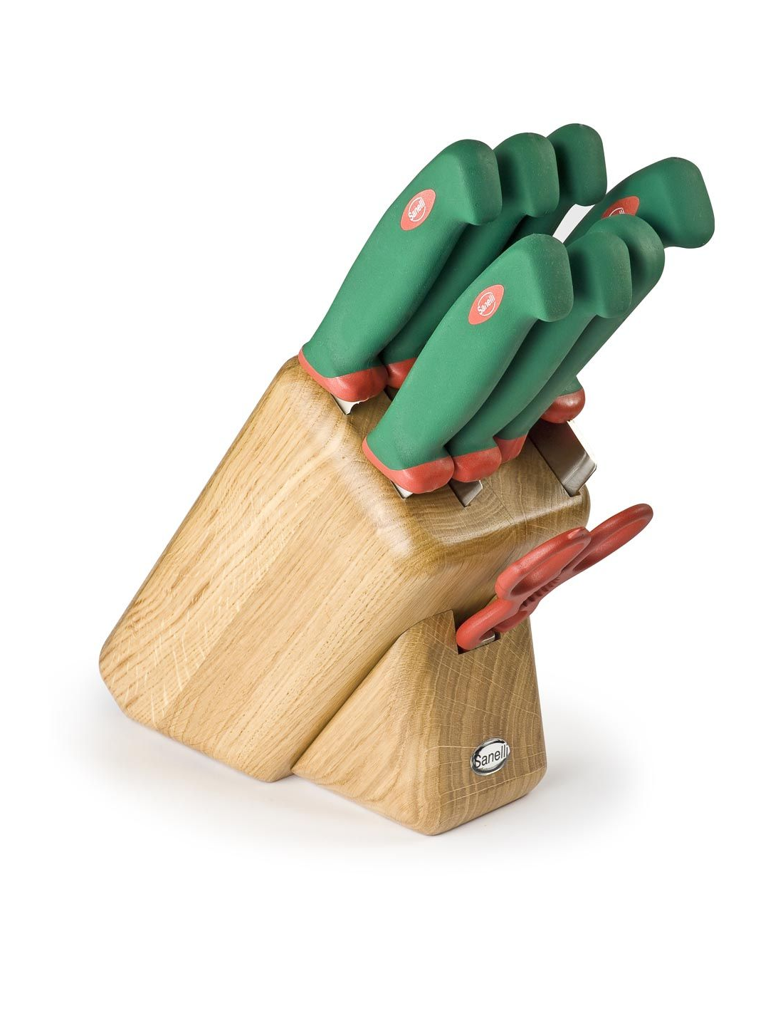 Набор ножей с подставкой Sanelli 945608 серии Premana Professional представляет собой расширенное профессиональное решение для оснащения кухни, включающее массивную подставку из натурального дуба и восемь функциональных инструментов. В комплект входят нож для жаркого длиной 24 см для аккуратной нарезки готового мяса, нож для ветчины длиной 24 см для деликатной работы с колбасными изделиями, зубчатый нож для хлеба длиной 24 см, универсальный кухонный нож длиной 18 см для фруктов и овощей, а также нож для обвалки длиной 16 см. Набор дополнен мощным кухонным топориком длиной 16 см для разрубания мяса с костями, мусатом длиной 22 см для поддержания идеальной остроты лезвий и профессиональными разборными ножницами из нержавеющей стали. Лезвия ножей изготовлены из высококачественной нержавеющей стали с твердостью 54–56 HRC, что обеспечивает длительное сохранение остроты и высокую износостойкость. Запатентованная эргономичная рукоятка зеленого цвета выполнена из нескользящего материала и оснащена антибактериальной технологией Biomaster с ионами серебра. Изделия полностью соответствуют международным нормам пищевой безопасности, выдерживают профессиональную стерилизацию и подходят для регулярного мытья в посудомоечной машине.