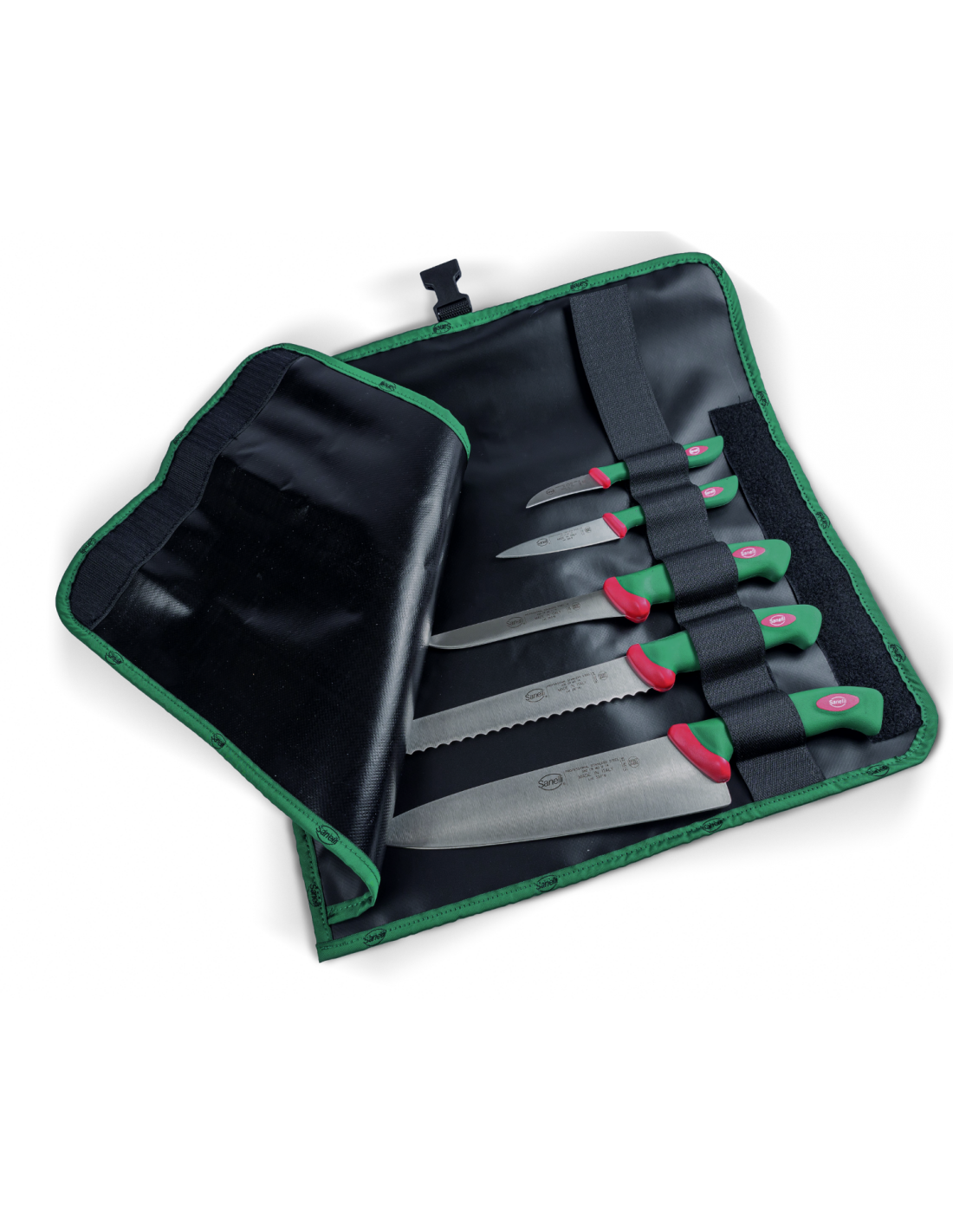 Профессиональный набор кухонных ножей Sanelli 980605 серии Premana Professional представлен в практичном защитном чехле-скрутке с моющейся внутренней поверхностью и надежной фиксацией на липучках. Эта линейка разработана специально для интенсивного ежедневного использования профессиональными поварами, сочетая в себе высокую надежность, гигиеничность и безопасность. Лезвия изготовлены из специальной нержавеющей стали с твердостью 54–56 HRC и оптимальной гибкостью, что гарантирует длительное сохранение остроты и легкость восстановления режущей кромки. Эргономичные запатентованные рукоятки зеленого цвета обладают антибактериальной защитой Biomaster на основе ионов серебра и шероховатой поверхностью для надежного антискользящего захвата. Набор включает пять основных инструментов, среди которых нож для хлеба длиной 24 см с зубчатым лезвием для нарезки выпечки и пиццы, нож для обвалки длиной 16 см для работы с мясом у кости, а также большой универсальный поварской нож длиной 25 см. Комплект дополняют овощной нож длиной 6 см для точных работ и нож для овощей длиной 10 см с полужестким лезвием. Все предметы набора выдерживают значительные температурные перепады, соответствуют строжайшим стандартам гигиены и подходят для мытья в посудомоечной машине и профессиональной стерилизации.