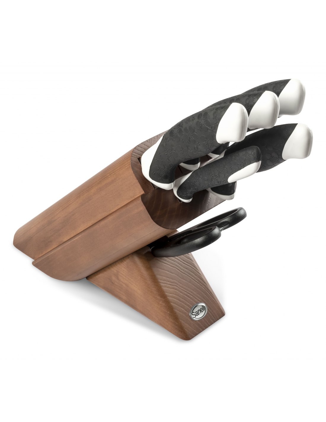 Профессиональный набор кухонных инструментов Sanelli 931506 серии Sakura поставляется в элегантной подставке Leck, изготовленной из натурального дерева вишни с характерным рисунком волокон и плавными закругленными линиями. Лезвия ножей выполнены из высококачественной нержавеющей стали марки AISI 420 C, обеспечивающей отличную устойчивость к коррозии и длительное сохранение остроты режущей кромки. Характерной особенностью серии является эргономичная двухкомпонентная рукоятка с уникальной антискользящей текстурой, напоминающей цветение сакуры, что гарантирует надежный захват и комфорт даже при длительной работе. Комплект состоит из ножа для жаркого длиной 23 см с полужестким лезвием для аккуратной нарезки готового мяса, ножа для хлеба длиной 23 см с зубчатым лезвием для выпечки и пиццы, универсального кухонного ножа длиной 18 см для овощей и фруктов, а также гибкого ножа для филетирования рыбы длиной 20 см, позволяющего выполнять сверхточные разрезы. Кроме того, набор содержит овощной нож длиной 10 см для чистки и подготовки продуктов и разборные кухонные ножницы из нержавеющей стали длиной 20 см. Весь набор соответствует строгим гигиеническим стандартам и подходит для регулярного мытья в посудомоечной машине.