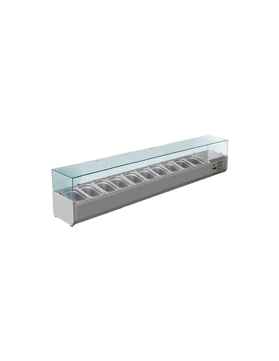 Настольная холодильная витрина Cooleq VRX 2000/330 изготовлена из высококачественной нержавеющей стали и предназначена для профессиональной демонстрации, охлаждения и кратковременного хранения салатов и закусок на предприятиях общественного питания и торговли. Данная модель отличается значительной вместительностью и рассчитана на установку десяти гастроемкостей формата GN1/4 с максимальной глубиной до 150 мм, однако следует учитывать, что сами емкости в комплект поставки не входят. Оборудование поддерживает стабильный температурный режим в диапазоне от +2 до +8 °С благодаря статической системе охлаждения и использованию безопасного фреона R600a весом 38 грамм. Устройство мощностью 180 Вт работает от стандартной электросети с напряжением 220 В. Габаритные размеры витрины без учета стекла составляют 2000х330х240 мм, в то время как полные нетто-размеры составляют 2000x335x440 мм при весе нетто 57 кг.