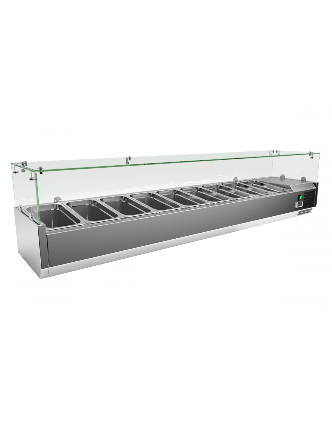 Настольная холодильная витрина Cooleq VRX 2000/380 изготовлена из высококачественной нержавеющей стали и предназначена для профессиональной демонстрации, охлаждения и кратковременного хранения салатов и закусок в заведениях общественного питания и торговли. Данная модель характеризуется значительной длиной и рассчитана на установку девяти гастроемкостей формата GN1/3 с максимальной глубиной до 15 см, при этом важно учитывать, что гастроемкости не входят в комплект поставки. Оборудование обеспечивает стабильный температурный режим в пределах от +2 до +8 °С благодаря статической системе охлаждения и использованию фреона R600a (38 г). Устройство мощностью 125 Вт работает от стандартной электросети с напряжением 220 В. Габаритные размеры витрины без учета стекла составляют 2000х380х240 мм, в то время как полные нетто-размеры составляют 2000x395x440 мм при весе 57 кг.