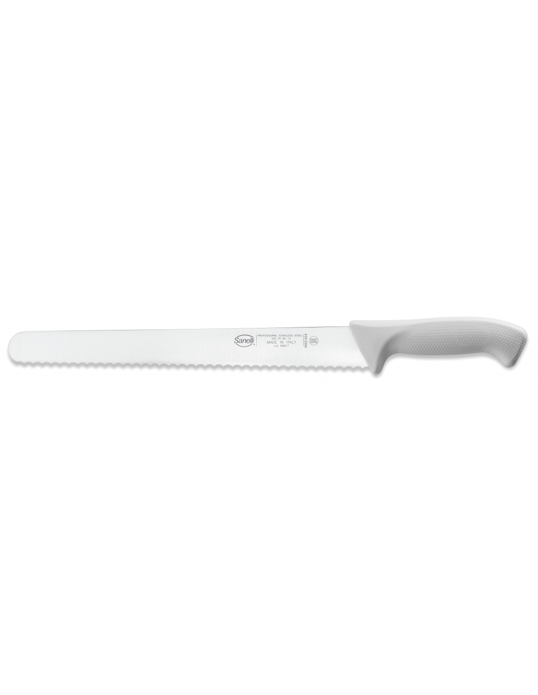 Профессиональный нож для хлеба Sanelli 302232.B из серии Skin оснащен полужестким зубчатым лезвием (серрейтором) длиной 32 см. Этот инструмент идеально подходит для нарезки хлеба, фокаччи и пиццы, обеспечивая чистый срез без разламывания корочки. Белый цвет рукоятки обеспечивает соответствие стандартам HACCP для четкой идентификации инвентаря для работы с выпечкой и молочными продуктами. Лезвие изготовлено из высококачественной нержавеющей стали Bonpertuis с твердостью 54–56 HRC, что гарантирует исключительную режущую способность и длительное сохранение остроты. Главным преимуществом серии Skin является инновационная эргономичная рукоятка с уникальной текстурированной поверхностью, которая обеспечивает надежный захват и полный контроль, предотвращая скольжение руки даже при интенсивном использовании. Материал рукоятки полностью соответствует строгим гигиеническим нормам безопасного контакта с пищевыми продуктами. Изделие устойчиво к профессиональной стерилизации и подходит для регулярного мытья в посудомоечной машине.