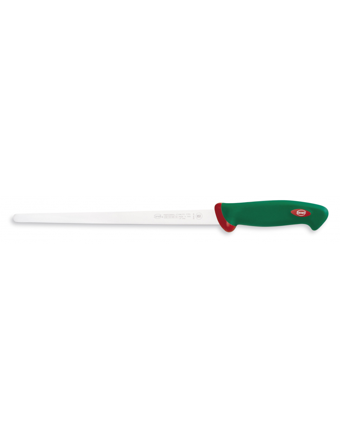 Профессиональный нож из серии Premana Professional от итальянского бренда Sanelli оснащен полужестким лезвием длиной 28 см, которое специально разработано для нарезки сыровяленого окорока (прошутто), зафиксированного в тисках. Благодаря своей форме и характеристикам инструмент также отлично подходит для нарезки лосося или мягких колбасных изделий. Лезвие изготовлено из высококачественной нержавеющей стали с уровнем твердости 54–56 HRC, что обеспечивает идеальный баланс между высокой режущей способностью, долговечностью заточки и необходимой гибкостью для точной работы. Запатентованная эргономичная рукоятка зеленого цвета выполнена по технологии двойного формования из нескользящего материала, что обеспечивает надежный захват и существенно снижает усталость руки при длительном профессиональном использовании. Важной особенностью является интегрированная антибактериальная добавка Biomaster с ионами серебра, обеспечивающая постоянную защиту и подавляющая рост микроорганизмов уже в первые минуты. Конструкция без зазоров в местах соединения металла и пластика гарантирует высочайший уровень гигиены, а устойчивость материалов к температурным колебаниям от -40°C до +150°C и агрессивным моющим средствам позволяет стерилизовать инструмент и мыть его в посудомоечной машине.