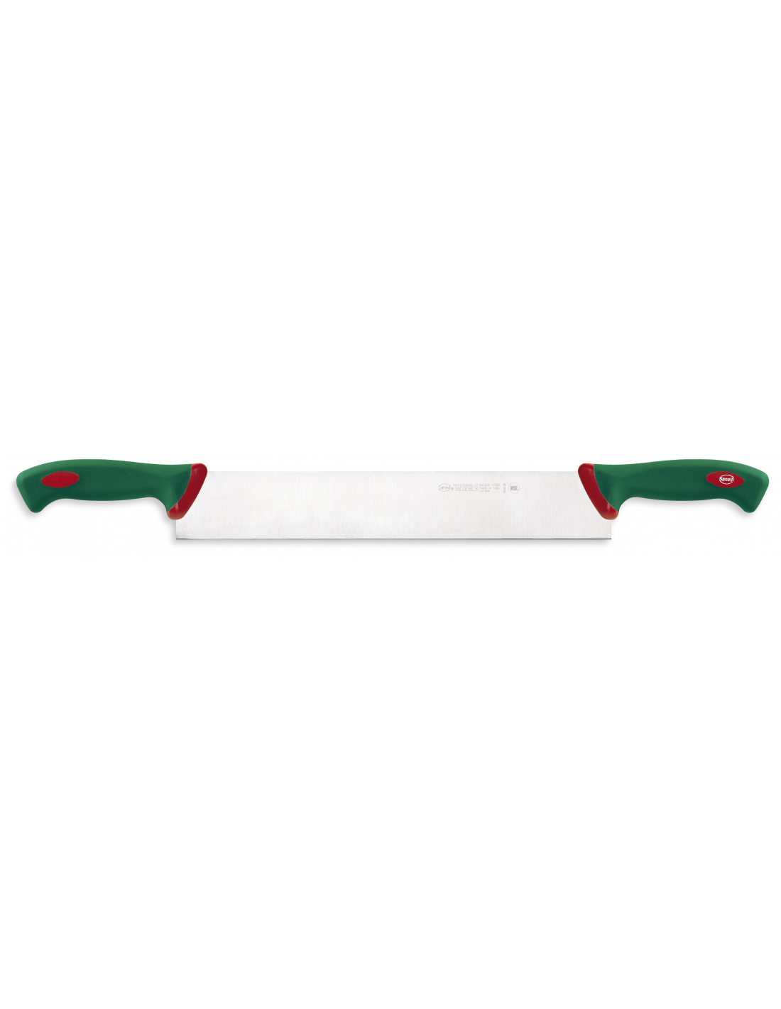 Профессиональный нож для сыра из серии Premana Professional от итальянского бренда Sanelli оснащен лезвием длиной 36 см и специально разработан для разрезания целых сырных голов. Главной конструктивной особенностью модели является наличие двух эргономичных рукояток, что позволяет мастеру прикладывать равномерное усилие по всей длине лезвия для точного и легкого разделения массивных форм сыра. Лезвие изготовлено из высококачественной нержавеющей стали с твердостью 54–56 HRC, что обеспечивает колоссальную силу реза и долговечность режущей кромки. Запатентованные рукоятки зеленого цвета имеют шероховатую нескользящую поверхность и выполнены с использованием антибактериальной добавки Biomaster с ионами серебра для постоянной гигиенической защиты. Конструкция без зазоров в местах соединения деталей гарантирует полное соответствие нормам пищевой безопасности, а устойчивость материалов к температурным колебаниям от -40°C до +150°C позволяет проводить стерилизацию и мыть нож в посудомоечной машине.