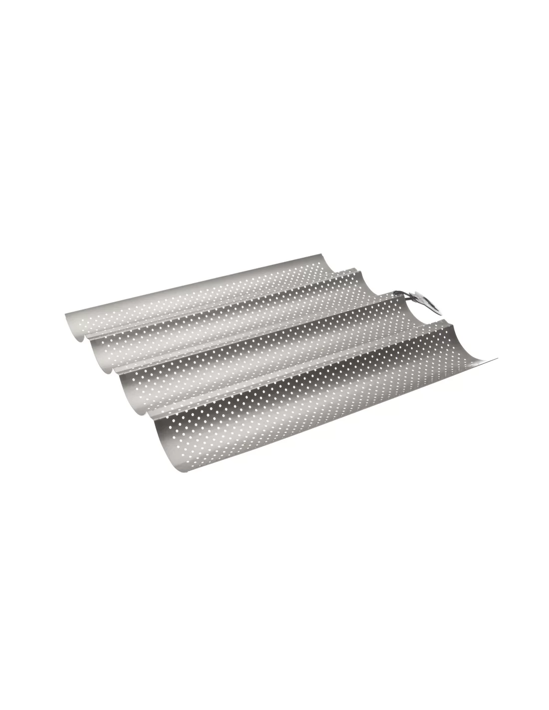 Противень для 4 багетов Ibili серии Moka 824804 — это профессиональный перфорированный инвентарь размером 38 x 33 см, разработанный для одновременной выпечки четырех домашних багетов с хрустящей корочкой. Изделие изготовлено из высокопрочной листовой стали с мелкой перфорацией, обеспечивающей свободную циркуляцию горячего воздуха и равномерный отвод влаги во время приготовления. Специальное двухслойное антипригарное покрытие PPG Xylan не содержит вредных примесей PFOA, благодаря чему готовая выпечка легко снимается, а изогнутая форма лотков помогает изделиям держать правильную форму, не растекаясь. Противень отличается высокой устойчивостью к термическим деформациям, долговечностью и максимальной практичностью, так как он пригоден для мытья в посудомоечной машине.