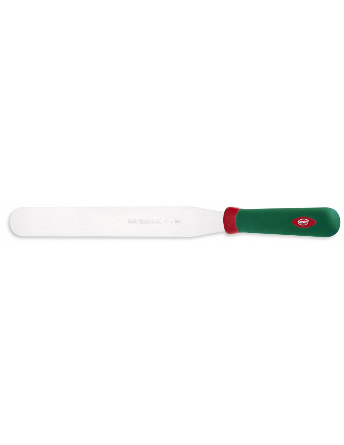 Профессиональная прямая лопатка из серии Premana Professional от итальянского бренда Sanelli оснащена гибким полотном длиной 27 см. Этот универсальный инструмент идеально подходит для кондитерских работ, в частности для равномерного нанесения и разглаживания кремов на тортах, а также для приготовления блюд на плите или гриле. Полотно изготовлено из высококачественной нержавеющей стали, обеспечивающей необходимую гибкость в сочетании с высокой прочностью. Запатентованная эргономичная рукоятка зеленого цвета выполнена по технологии двойного формования из нескользящего материала, что гарантирует надежный захват и комфорт при длительной работе. Интегрированная антибактериальная добавка Biomaster с ионами серебра обеспечивает постоянную гигиеническую защиту. Изделие полностью соответствует нормам пищевой безопасности, выдерживает стерилизацию и подходит для мытья в посудомоечной машине.