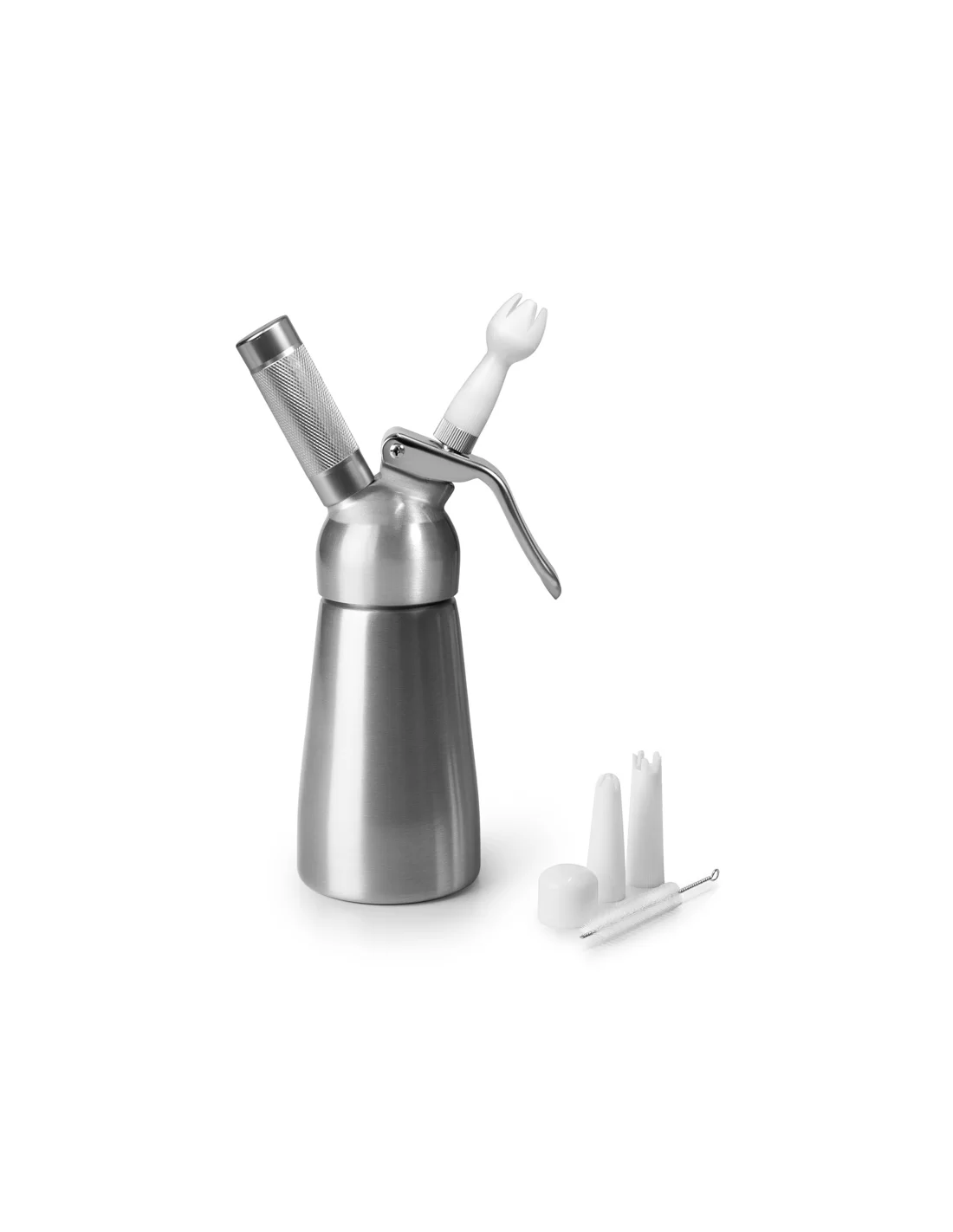 Сифон для сливок Ibili — это профессиональное кулинарное устройство, предназначенное для быстрого приготовления взбитых сливок, нежных муссов, десертных кремов и соусов. Корпус изделия полностью изготовлен из высококачественного алюминия, что обеспечивает прочность конструкции, легкость в эксплуатации и длительное поддержание низкой температуры содержимого. Данный кухонный инструмент совместим со стандартными баллончиками N2O и позволяет создавать идеальную текстуру взбитых продуктов для профессионального декорирования блюд. Модельный ряд представлен в трех вариантах объема: компактный 0,25 л (750902), универсальный 0,5 л (750905) и вместительный 1 л (750910), что позволяет подобрать оптимальный размер для любых задач. Надежность от испанского бренда Ibili и эргономичный дизайн делают этот сифон незаменимым помощником как для профессиональных кондитеров, так и для любителей создавать изысканные десерты дома.