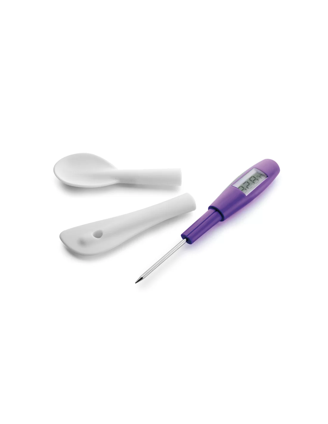 Цифровой термометр 3-в-1 Ibili 790900 длиной 25 см — это многофункциональный кухонный набор, состоящий из электронного термометра со щупом из нержавеющей стали и двух сменных силиконовых насадок: лопатки и ложки. Такая конструкция позволяет одновременно перемешивать ингредиенты и с высокой точностью контролировать температуру блюд непосредственно в процессе приготовления. Устройство идеально подходит для темперирования шоколада, приготовления карамели, джемов, соусов или детского питания, работая в широком диапазоне от -50°C до +300°C. Силиконовые насадки белого цвета легко снимаются для мытья, а сам термометр в фиолетовом корпусе можно использовать отдельно в качестве профессионального контактного щупа для мяса или выпечки. Комплект отличается эргономичным дизайном, обеспечивает мгновенное считывание данных на четком ЖК-дисплее и является незаменимым инструментом для достижения идеального результата на современной кухне.