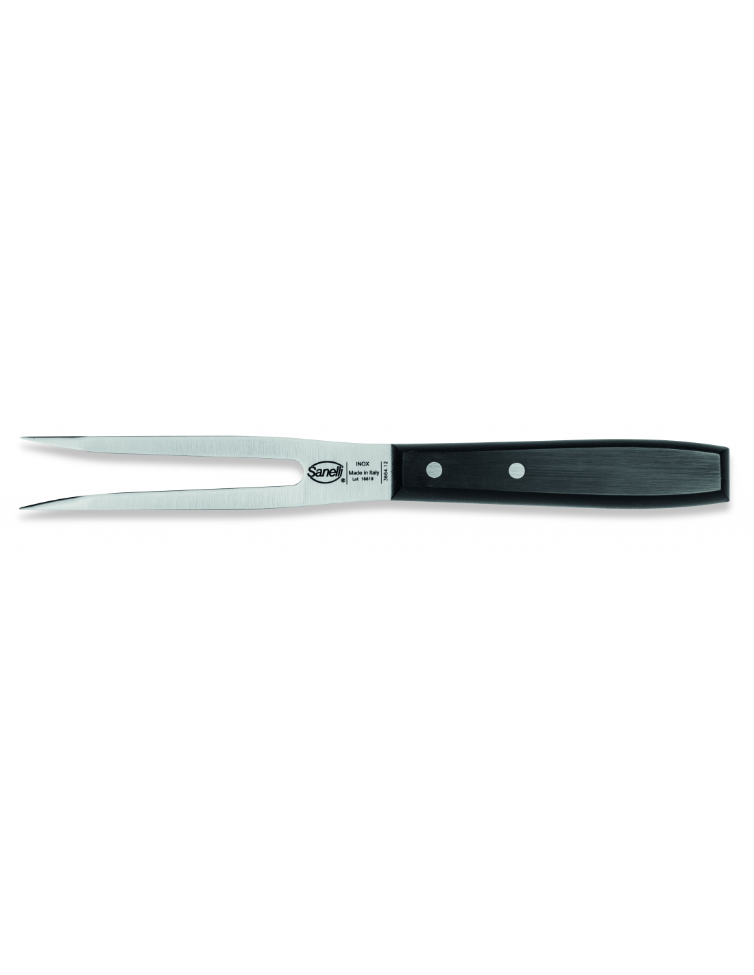Профессиональная вилка для мяса Sanelli 366412 серии Steak с короткой рабочей частью длиной 12 см — это незаменимый инструмент для каждого мастера барбекю и шеф-повара. Изготовленная из высококачественной нержавеющей стали марки AISI 420C, она обеспечивает надежную фиксацию жаркого, птицы или крупных кусков мяса во время нарезки, предотвращая их скольжение и гарантируя точность каждого разреза. Благодаря острым зубьям вилка позволяет легко проверять степень готовности продуктов, а также безопасно извлекать их из кастрюли или снимать с гриля, избегая риска ожогов. Элегантная рукоять из черного полиоксиметилена (POM) с прочными алюминиевыми заклепками отличается превосходной эргономикой, сбалансированностью и высокой устойчивостью к интенсивной эксплуатации. Изделие соответствует строгим стандартам гигиены, легко очищается и является идеальным дополнением к профессиональному набору ножей для работы с мясными деликатесами как в ресторанах, так и на домашней кухне.