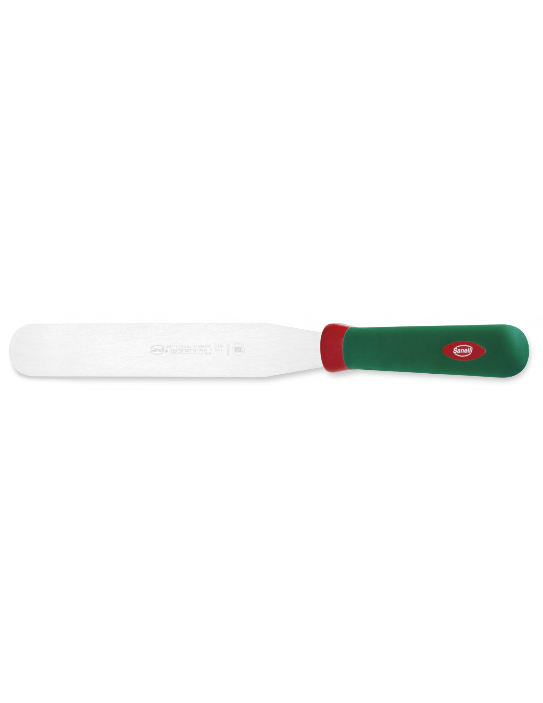 Професійна пряма лопатка із серії Premana Professional від італійського бренду Sanelli оснащена гнучким полотном довжиною 22 см. Цей універсальний інструмент ідеально підходить для кондитерських робіт, зокрема для рівномірного нанесення та розгладжування кремів на тортах, а також для приготування страв на плиті або грилі. Полотно виготовлене з високоякісної нержавіючої сталі, що забезпечує необхідну гнучкість у поєднанні з високою міцністю. Запатентована ергономічна рукоятка зеленого кольору виготовлена за технологією подвійного формування із нековзного матеріалу, що гарантує надійне захоплення та комфорт під час тривалої роботи. Інтегрована антибактеріальна добавка Biomaster з іонами срібла забезпечує постійний гігієнічний захист. Виріб повністю відповідає нормам харчової безпеки, витримує стерилізацію та придатний для миття в посудомийній машині.