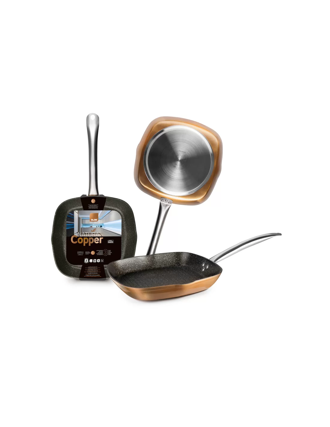 Квадратна сковорода-гриль серії Natura Copper від іспанського бренду Ibili виготовлена з алюмінію з мідним оздобленням та оснащена професійною трубчастою ручкою з нержавіючої сталі на заклепках, яка не нагрівається під час приготування. Виріб має товщину 4-5 мм, що забезпечує високу стійкість до деформації та довговічність. Ключовою перевагою є технологія Full Induction з повним дифузійним дном (сталевий диск 18%), що гарантує максимальну енергоефективність та швидке рівномірне нагрівання на всіх типах плит, особливо індукційних. Поверхня має тришарове антипригарне покриття «кам'яного» стилю без вмісту PFOA, яке вирізняється високою корозійною стійкістю. Особливістю конструкції є наявність носика для зручного зливання жиру. Посуд придатний для використання в духових шафах при температурі до 230°C та підходить для миття в посудомийній машині. Модель з артикулом 495228 має розміри 28х28 см, висоту бортиків 4,2 см та діаметр дна 19 см.