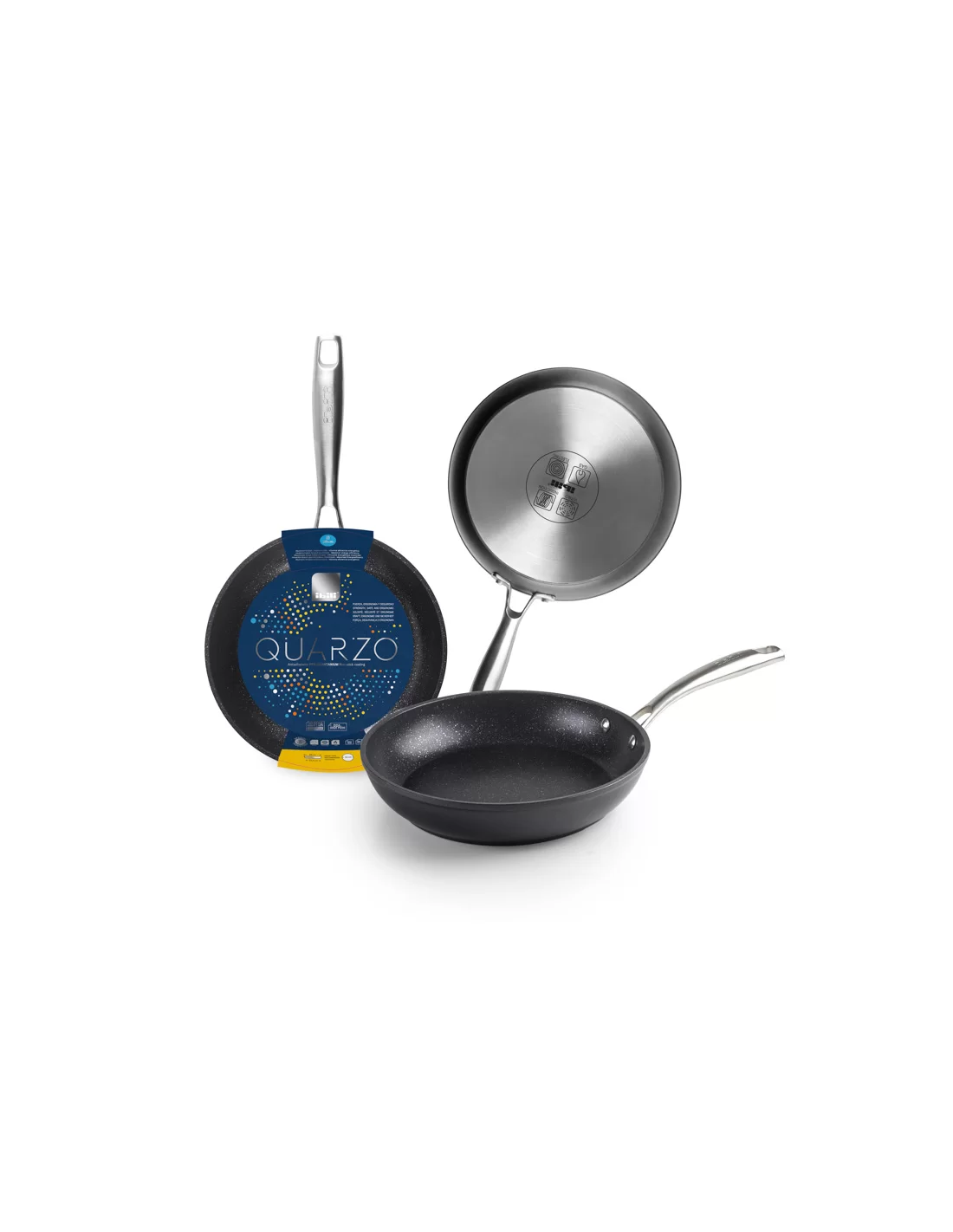 Сковорода серії Quarzo від іспанського бренду Ibili виготовлена з високоякісного кованого алюмінію та оснащена надійною ручкою з нержавіючої сталі на заклепках. Виріб має товщину стінок 4-5 мм, що забезпечує виняткову міцність, довговічність та стійкість до деформації навіть при інтенсивних термічних навантаженнях. Ключовою перевагою є технологія Full Induction з повним дифузійним дном, що гарантує максимальну енергоефективність, швидке та рівномірне нагрівання на всіх типах плит, особливо індукційних. Поверхня має тришарове антипригарне покриття QuanTanium у «кам’яному» стилі, яке не містить PFOA, є безпечним для здоров’я та екологічно чистим. Посуд є універсальним професійним інструментом: він сумісний з усіма типами варильних поверхонь, а також придатний для використання в духових шафах при температурі до 230°C.
