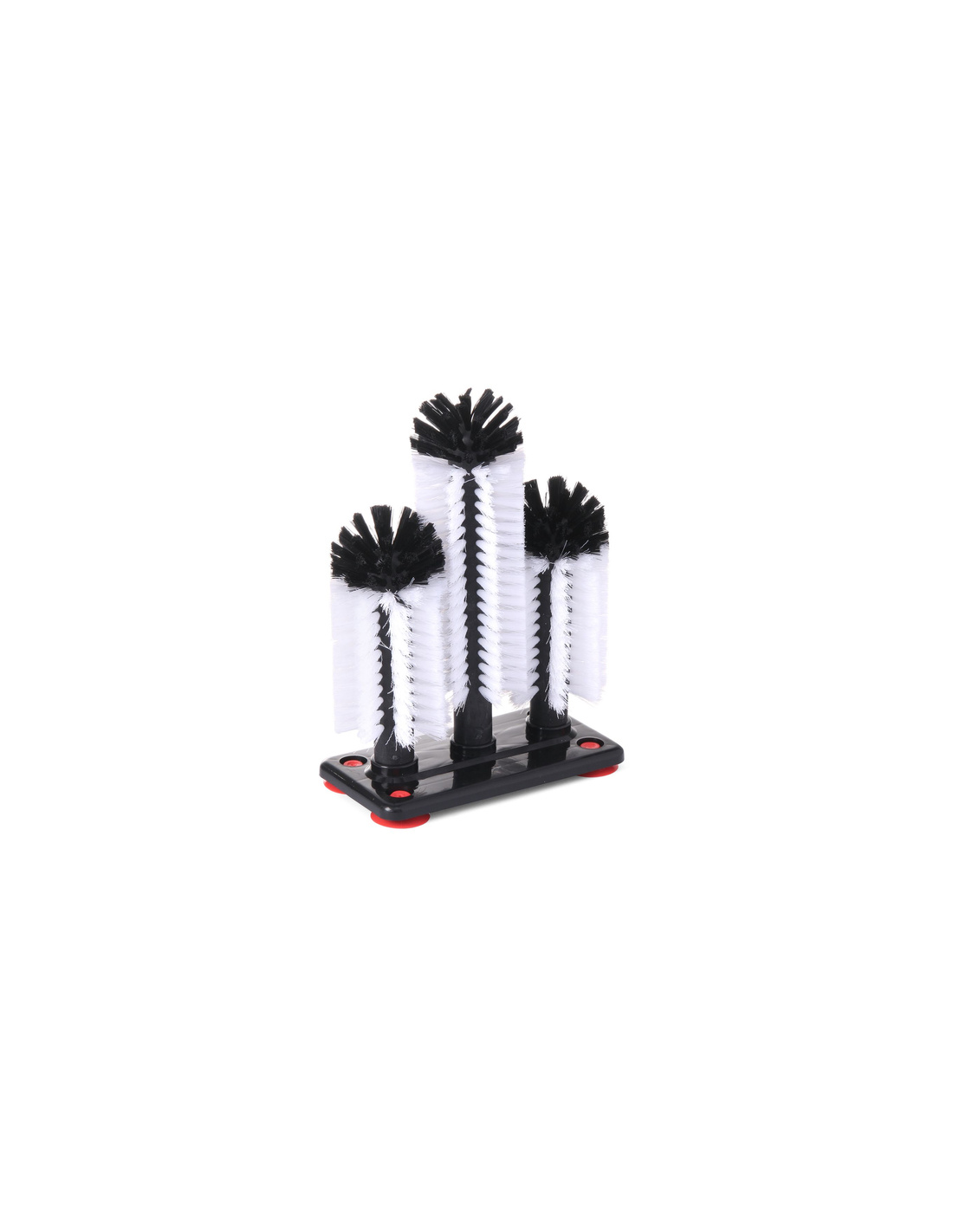 Щітки для миття склянок Hendi 696040 є практичним та ефективним інструментом для швидкого ручного очищення скляного посуду, келихів та пивних кухлів безпосередньо у мийній ванні. Цей аксесуар складається з трьох вертикальних щіток, закріплених на міцній поліпропіленовій основі, де центральна щітка має висоту 250 мм, а дві бічні — по 180 мм, що дозволяє одночасно та якісно очищувати внутрішню та зовнішню поверхні посуду різного розміру. Для надійної фіксації та стабільності під час роботи виріб обладнаний потужними присосками, які міцно утримують конструкцію на дні мийки, запобігаючи її зміщенню. Загальні габарити пристосування складають 190x100 мм, а жорстка нейлонова щетина забезпечує ретельне видалення забруднень, роблячи процес миття максимально продуктивним у барах, кафе та інших закладах громадського харчування з великим обігом напоїв.