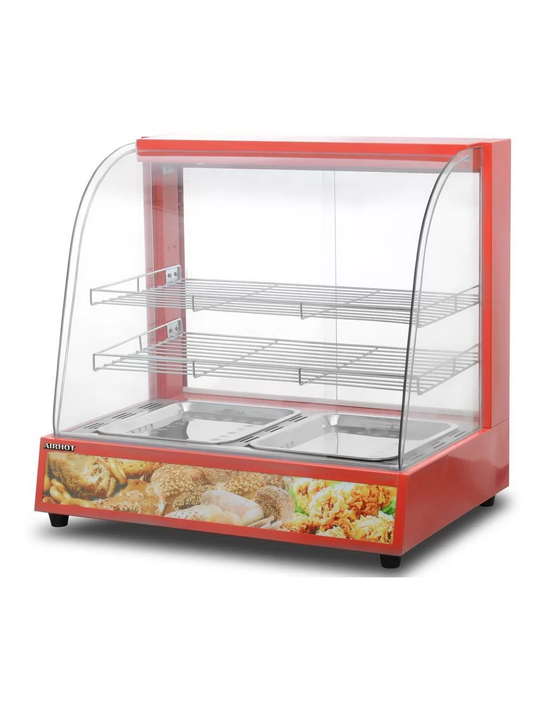 Настільна теплова вітрина Airhot HW-2 призначена для підігріву, короткочасного зберігання та ефективної демонстрації випічки, кондитерських виробів та різноманітних гарячих закусок. Конструкція з гнутим склом та вертикальним склінням забезпечує відмінний огляд усієї експозиції, привертаючи увагу відвідувачів до страв. Корпус пристрою виготовлений із міцної пофарбованої сталі, а внутрішній простір обладнаний двома полицями та комплектується двома піддонами для зручного розміщення продукції. З боку оператора розташовані розсувні дверцята, що полегшують процес обслуговування та викладки товарів. Завдяки вбудованому терморегулятору в вітрині підтримується температурний режим від +30 до +80 градусів, при цьому обладнання потужністю 1,1 кВт працює від стандартної мережі з напругою 220 В