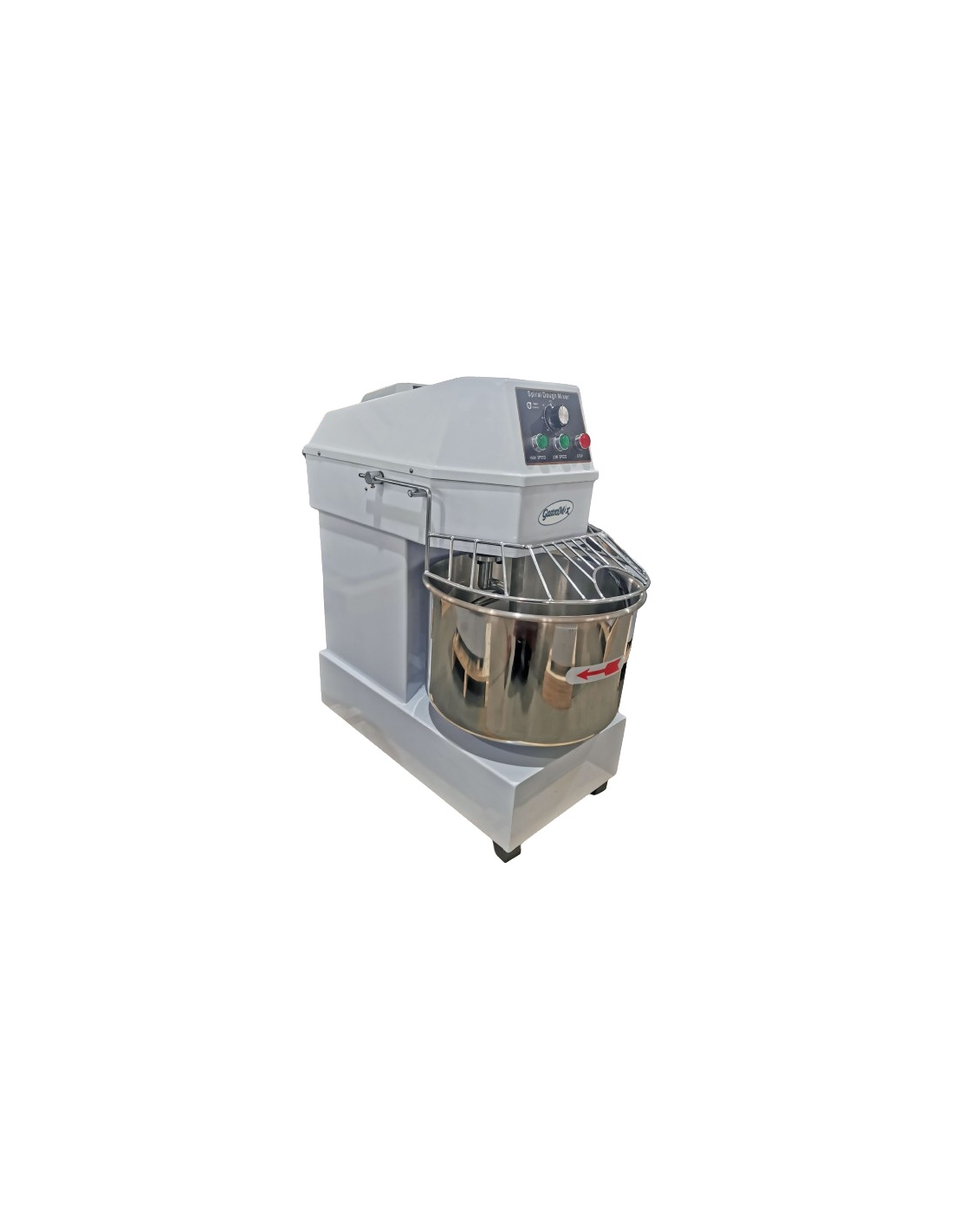 Професійний спіральний тістоміс Gastromix HS40B — це потужне підлогове обладнання, спеціально розроблене для якісного замішування різних видів тіста з вологістю не менше 50% у пекарнях, піцеріях та на великих кухнях. Модель оснащена фіксованою діжею об'ємом 40 літрів, що дозволяє завантажувати до 15 кг борошна за один робочий цикл. Апарат має дві фіксовані швидкості (швидкість спіралі 123/246 об/хв та діжі 13/25 об/хв) та функцію реверсу, що забезпечує ідеальну текстуру замісу. Надійний ремінний привід гарантує стабільну роботу, а вбудований таймер на 60 хвилин дозволяє автоматизувати процес. Корпус пристрою виконаний із фарбованого металу, а діжа та захисна решітка виготовлені з високоякісної нержавіючої сталі. Для безпеки оператора передбачено мікровимикач на кришці діжі. Обладнання працює від мережі 380 В (штекер живлення 25–32 А купується окремо) та має габарити 770x440x850 мм.